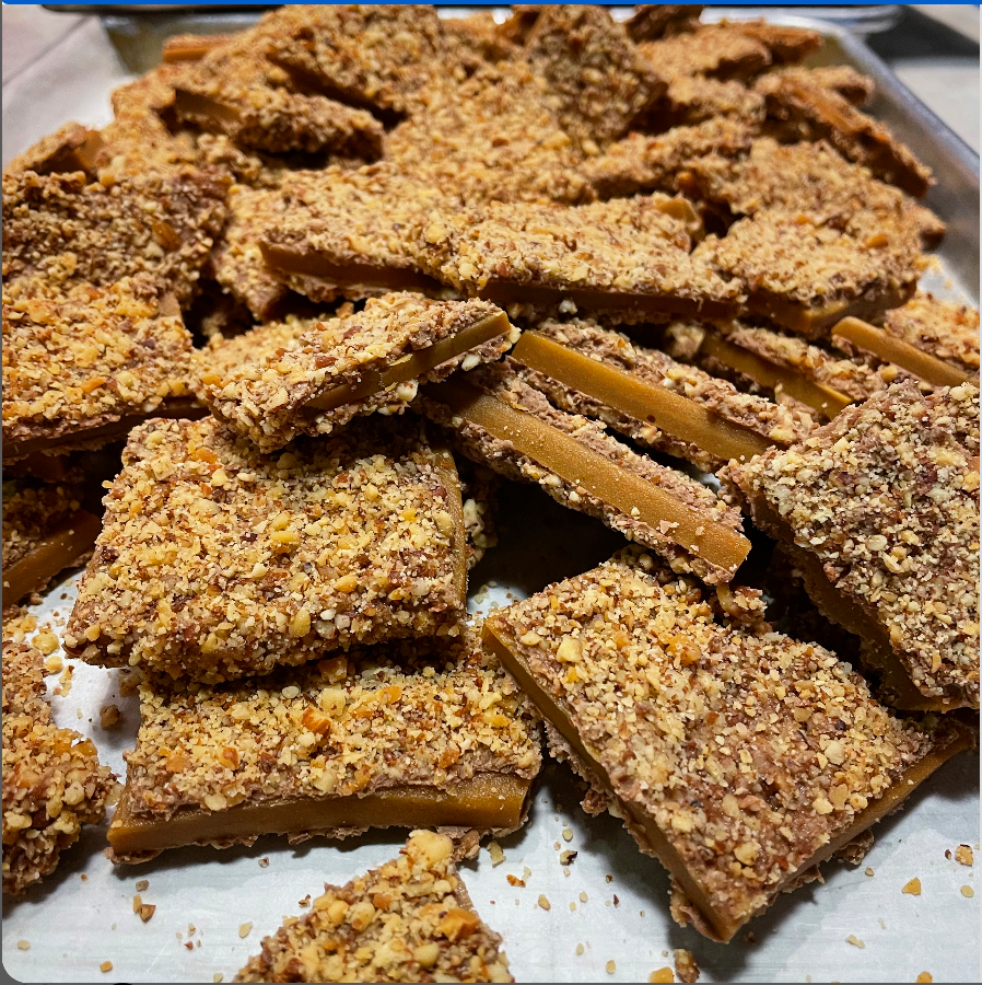 A hard caramel-like flavor, coated in Peter's fine Swiss chocolate, and crushed roasted almonds.